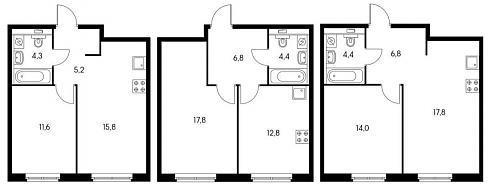 Двухкомнатные. При серьезной разнице в размере таких квартир, покупателю доступны линейные и распашные планировки (гостевой санузел прилагается в любом случае):