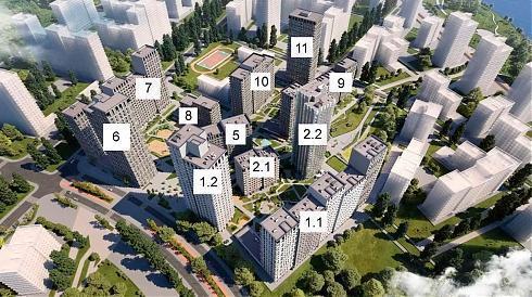 к. 2.1: 10-11 этажей (2 секции), 48 квартир, 5 коммерческих помещений.