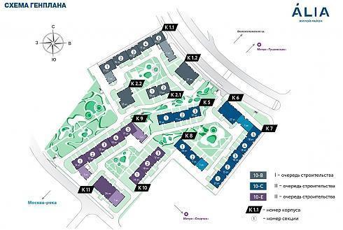 ЖК «АЛИА» состоит из 11 корпусов, строительство которых ведется в две очереди, при этом вторая очередь разделена на две группы домов с обозначением 10-С и 10-Е.