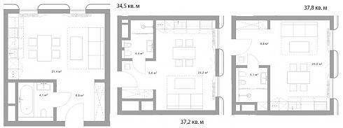 Однокомнатные апартаменты делятся на два подвида: часть их, площадью от 34,5 до 37,8 кв. м, подразумевает чисто студийную планировку, в которой по большому счету варьируется только площадь санузла: