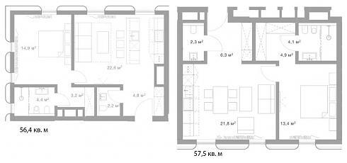 В категории от 55,0 до 55,8 кв. м в таких апартаментах зоны кухни-гостиной и спальни будут изолированы, и практически везде предусмотрено место для размещения дополнительного санузла: