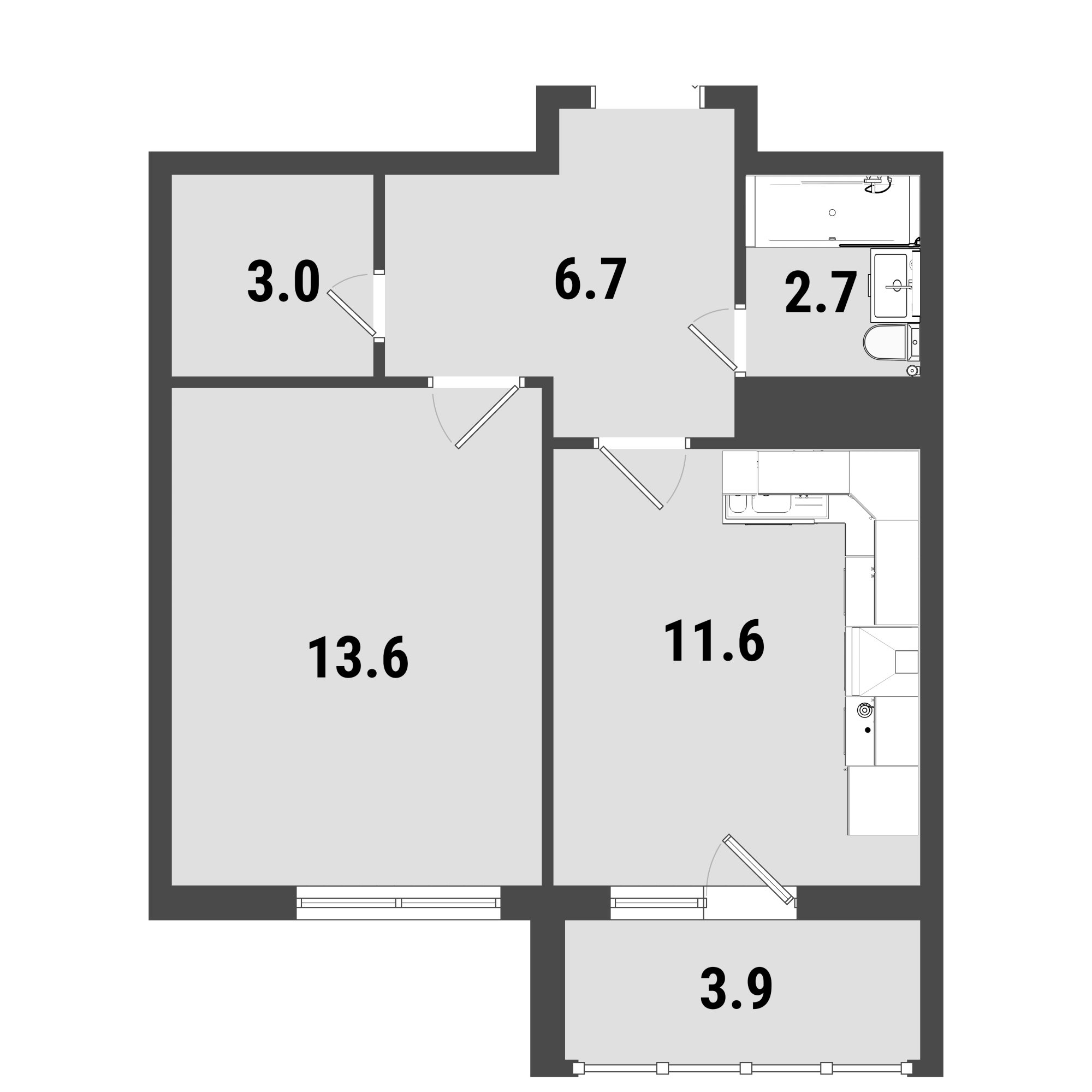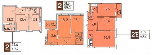 Скромные угловые 49-метровые двухкомнатные квартиры расположились во втором корпусе, основной массив предложений двушек и «евро-двушек» расположился между 57 и 65 кв. м общей площади: