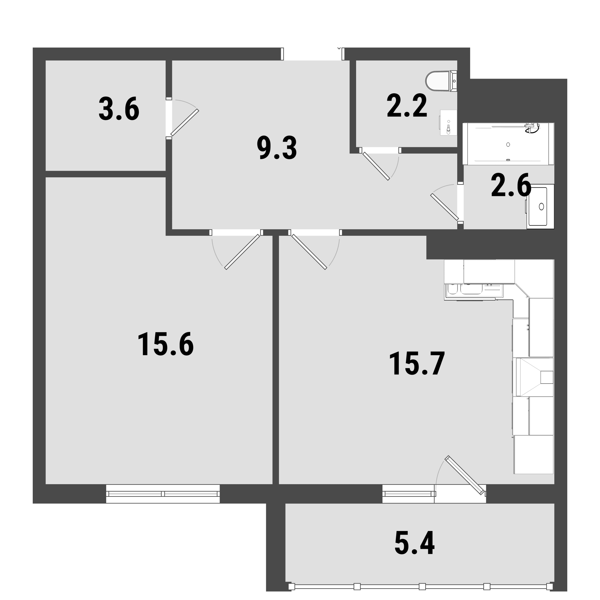 В корпусе №2 трешек оказалось намного меньше, при этом не совсем понятна причина скромности застройщика, оказавшегося от употребления термина «четырехкомнатная евро-квартира», который в данном случае был бы абсолютно уместен: