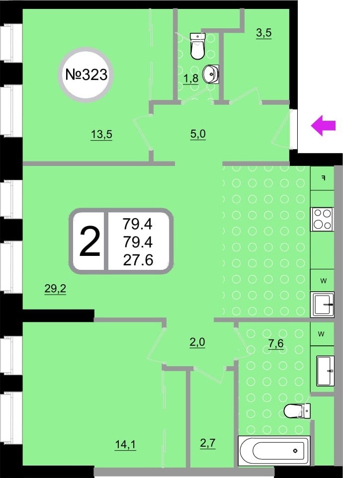 Самые интересные двухкомнатные квартиры находятся в 12 корпусе – 75 кв. м, два санузла, две гардеробные комнаты: