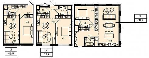 Все двухкомнатные апартаменты построены по принципу «спальня + гостиная с выделенной кухонной зоной». На выбор предлагаются линейные и угловые планировки из нескольких типоразмеров: