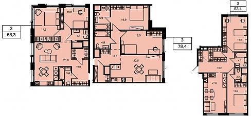 По такой же системе распределяются метры в трехкомнатных апартаментах – спален при любом раскладе тут будет две, основной массив предложений приходится на угловые и линейные трешки в секции №1, особняком стоят отличные распашонки во второй секции: