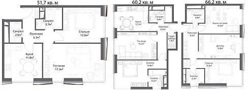 Планировочные решения трехкомнатных квартир характерны тотальным отделением жилой зоны от расположенной на отшибе зоны кухни: