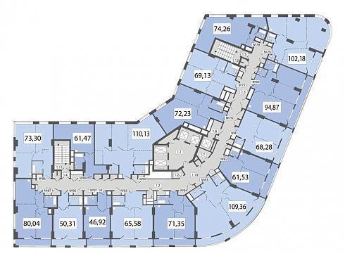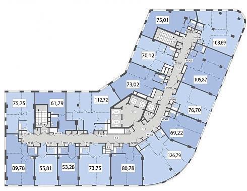 отличаются незначительно − везде расположено по 16 апартаментов, обслуживаемых двумя пассажирскими и двумя грузопассажирскими лифтами SCHINDLER (еще один лифт предназначен для служебно-хозяйственных целей). Внутренних перегородок в апартаментах не будет, за исключением стен в т.н. мокрых зонах, высота потолков составляет 2,95 м в черновом варианте. По поводу панорамных окон показания менеджеров ПИКа расходятся: по одной из версий, до 23 этажа они будут лишены функции открывания, а начиная с 24 – оборудованы форточками. По другой, окна на всех этажах будут открываться под углом 30 градусов. В любом случае, чисткой фасадов и мытьем окон будет заниматься Управляющая Компания, а станет ей, к гадалке не ходи, всем хорошо знакомый ПИК-Комфорт. Коммуникации центральной системы кондиционирования заведены внутрь, устанавливаются неплохие металлические двери. Специфическая форма здания не могла не отразиться на внутренних планировках, среди которых классические варианты