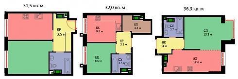 В вариантах с площадью превышающей 50 кв. м зона кухни существует изолированно от жилых зон:
