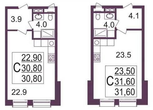 Студии. Жаль, что в них, по большей части, отсутствуют лоджии. Но и без них такие апартаменты выглядят более-менее самодостаточными, чему способствуют не самые малые их метражи: