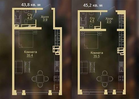 Однокомнатные квартиры отличаются друг от друга кардинально: в первом случае Вы получите классическую раздельную планировку с двумя санузлами в придачу, второй вариант предполагает, практически, студийную планировку с непринужденным намеком на легкое зонирование: