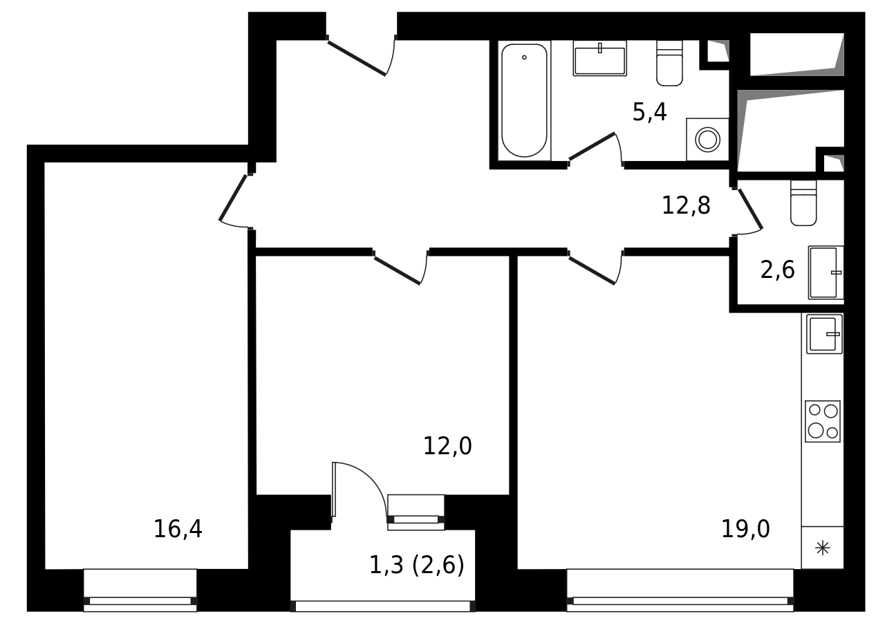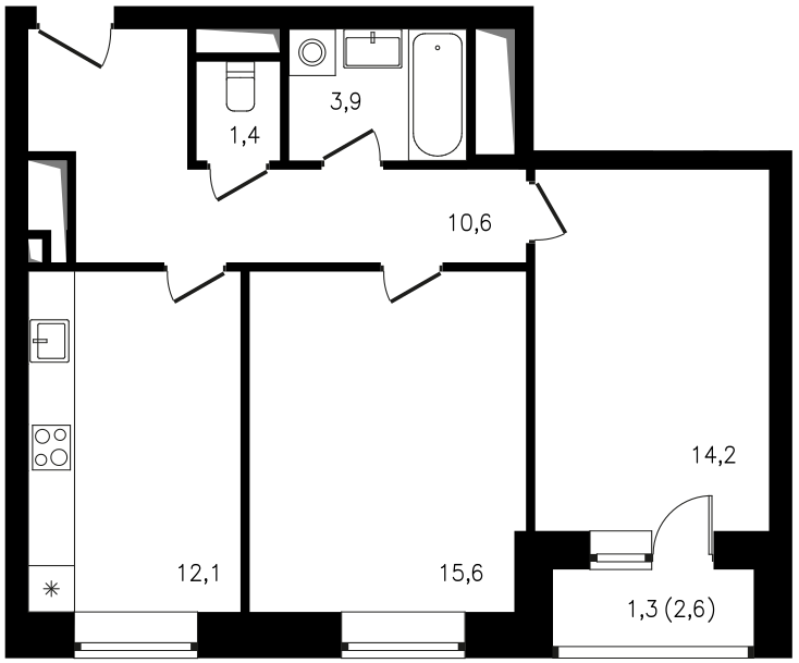 Похожая схема реализована и в двухкомнатных квартирах комплекса – до 60 квадратов это классика,