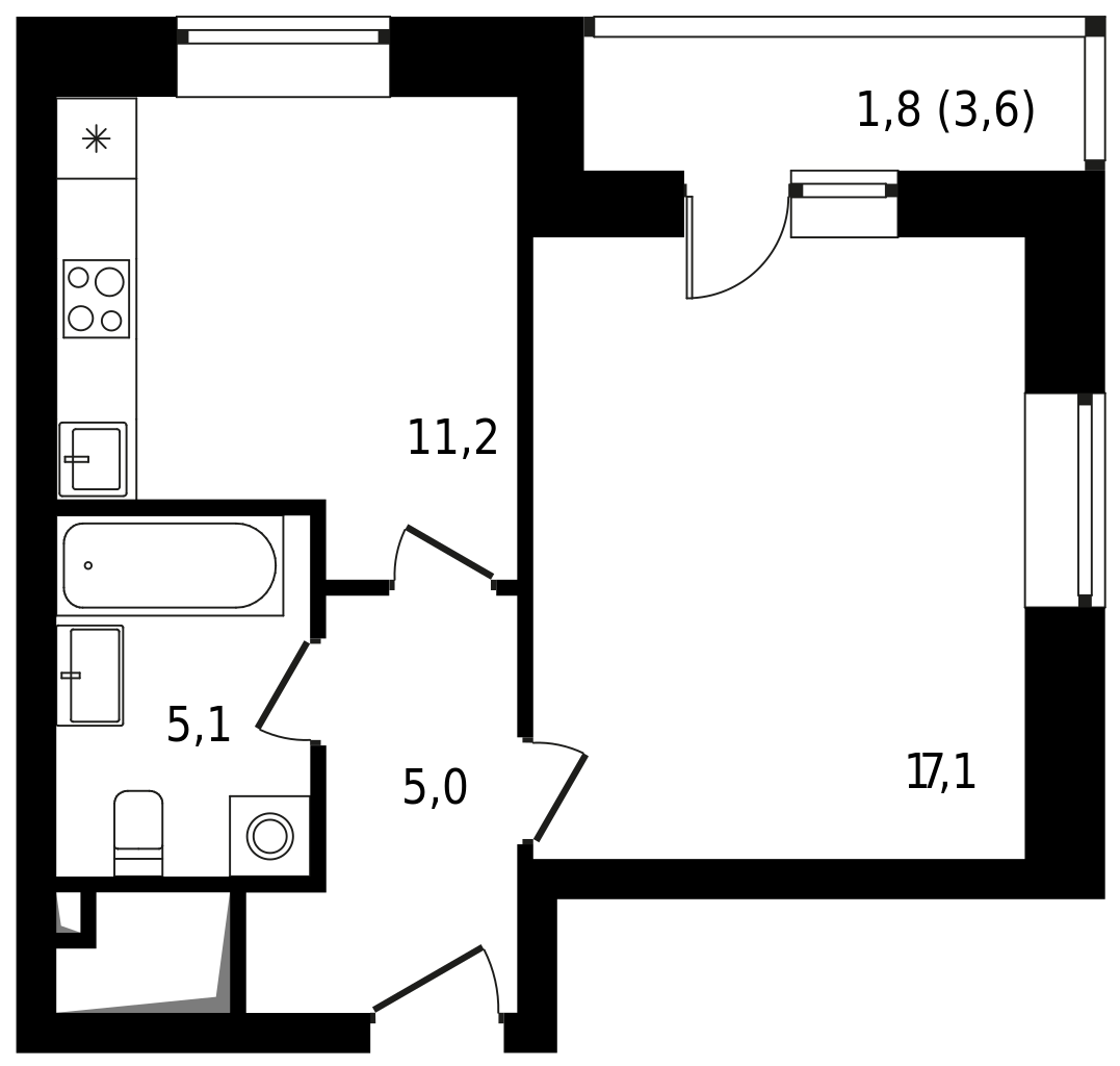 В однокомнатных квартирах площадью до 38 кв. м основные метры ушли в пользу жилой комнаты, в квартирах большего метража применяется «европейский» принцип планировки:
