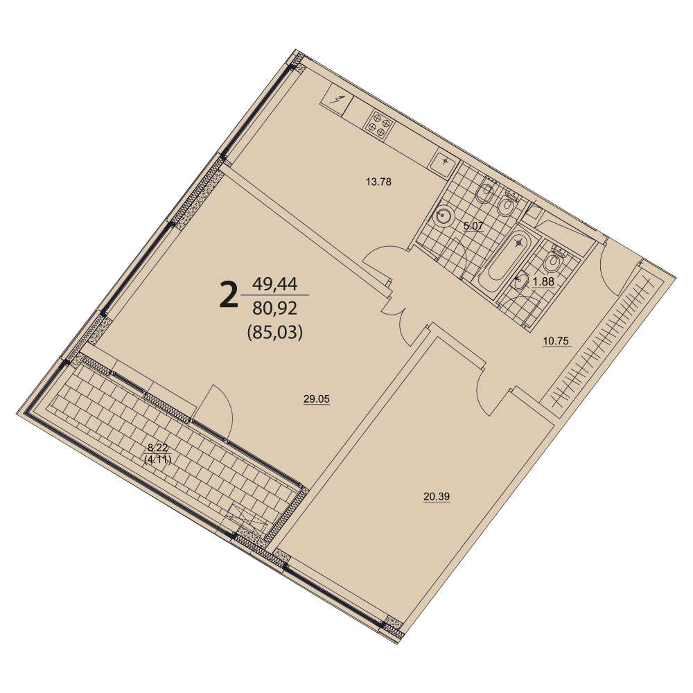 Однокомнатных квартир в «Призме» нет, помимо отряда «верхних» двушек», на других этажах встречаются два типа двухкомнатных квартир и один евро-вариант: