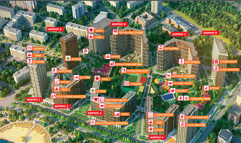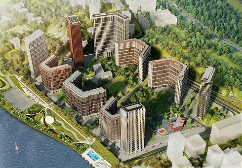 На территории в 14 ГА в итоге будут построены десять жилых корпусов высотой от 19 до 43 этажей. Вентилируемые фасады монолитно-кирпичных зданий будут облицованы керамогранитом и клинкерной плиткой с вкраплениями металлических панелей.