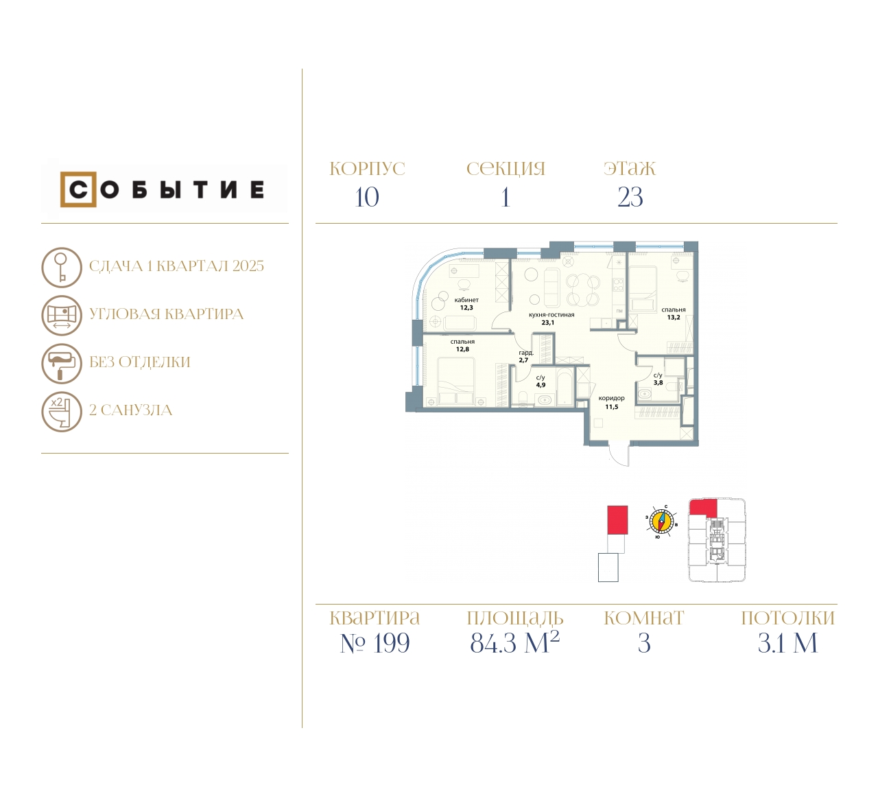 | Сентябрь 2023 | 82.3-143.5 м2 | 38 145 227 - 70 624 581 ₽ | ~481 709 ₽ | 12.73% |