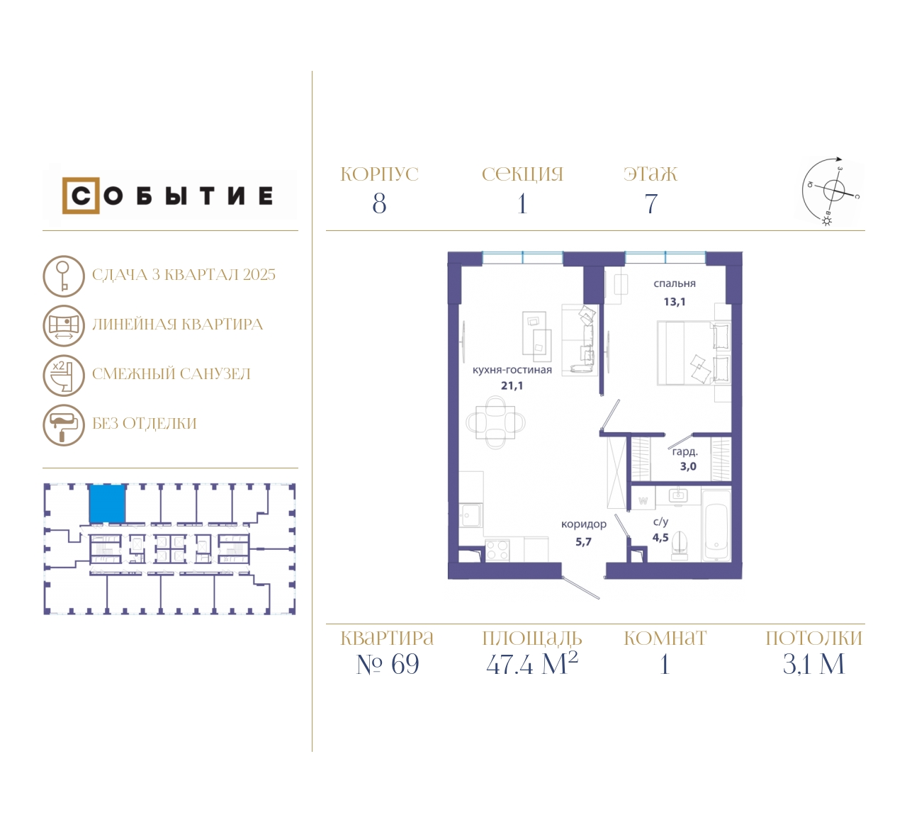 | Сентябрь 2021 | 40,8-47,7 м2 | 17 575 980 - 21 204 400 ₽ | ~445 751 ₽ | 5.08% |
