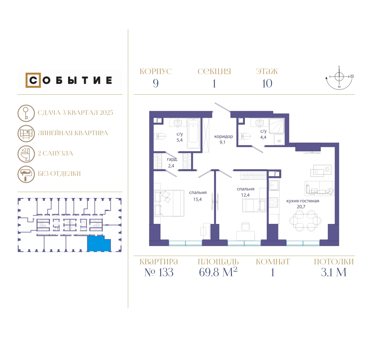 к. 3: 50 этажей, 1 секция, 579 квартир, 759 машино-мест, 339 кладовых - РВЭ ожидается в III квартале 2025 года.