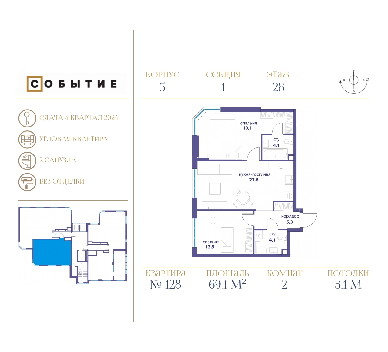 к. 1: 16-29 этажей, 5 секций, 647 квартир, 497 машино-мест, включая зависимые, 153 кладовые - РВЭ ожидается в IV квартале 2024 года.