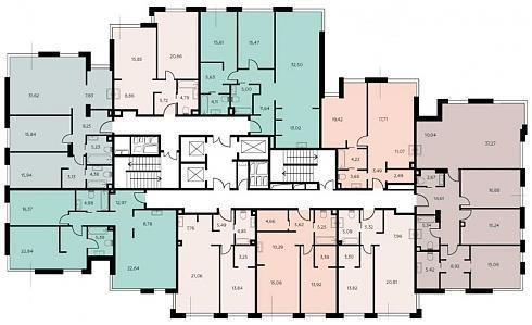 По этому параметру оба корпуса выглядят абсолютно идентично, являясь, по сути, башнями-близнецами. Количество апартаментов на их этажах навевает мысли о социальной лестнице – чем выше, тем их меньше, тем они круче, дороже и т.п.