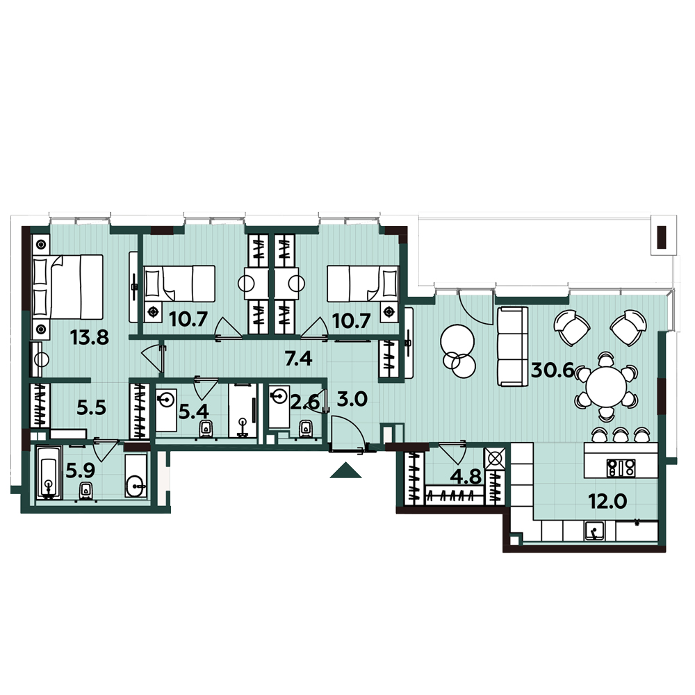 Три полноценные спальни можно получить в четырехкомнатных евро-апартаментах, бонусом прилагаются дополнительные санузлы, гардеробные и даже постирочная: