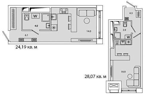 В корпусе М5 больше 21 кв. м в студии получить не выйдет, в М4 соседствуют маленькие и средние варианты таких квартир: