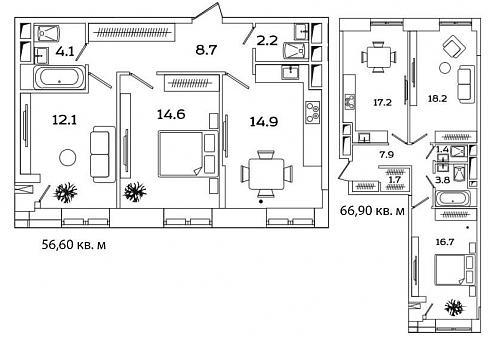 В корпусах М2, М4, М5 и М7 представлена пара вариантов распашных планировок, при этом разница в площадях квартир будет внушительной: