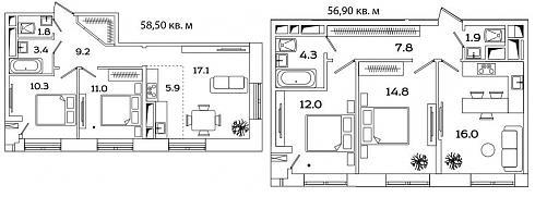 В корпусе М3 преобладают угловые и линейные варианты планировок площадью 56-60 кв. м:
