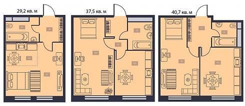 Рассуждать о разнообразии представленных планировочных решений применительно к студиям и однокомнатным квартирам не приходится – принципы понятны, несущественные различия кроются лишь в метражах: