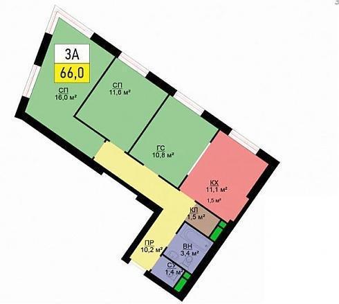 То же самое разделение наблюдается в трехкомнатных квартирах, самые небольшие из которых имеют площадь 66 кв. м: