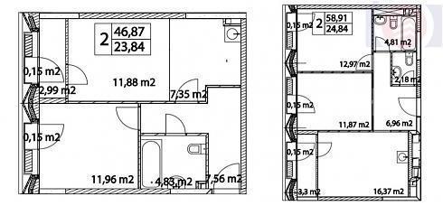 Желающим купить двушку с изолированными комнатами следует обратить свое внимание на второй подъезд первого корпуса, где представлены классические угловые и линейные варианты двухкомнатных квартир: