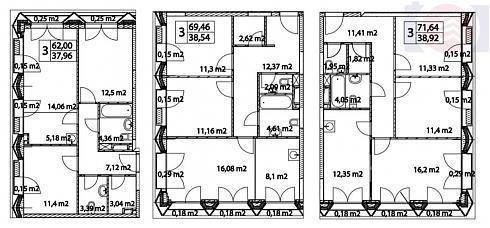 62-метровые трехкомнатные квартиры лучше сразу воспринимать как евро-трешки (вряд ли кто-то, находясь в здравом уме, отделит 5-метровую кухоньку так, как это демонстрирует сайт проекта). С 69-метровой трешкой происходит такая же история, на 72 квадратах в принципе можно разместить и три изолированные комнаты:
