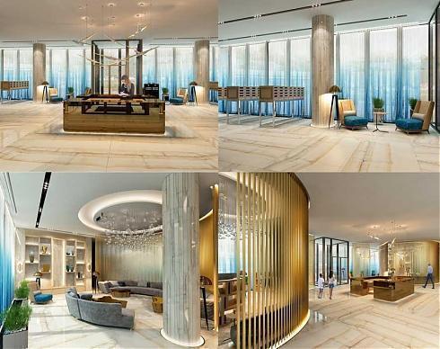 Начиная со второго этажа здесь расположены апартаменты в количестве 295 штук, в двухуровневом паркинге размечено 152 машиноместа, 27 из которых являются зависимыми. Апартаменты передаются покупателям без отделки, будущие межкомнатные перегородки, а также границы санузлов отмечены трассировкой по полу.