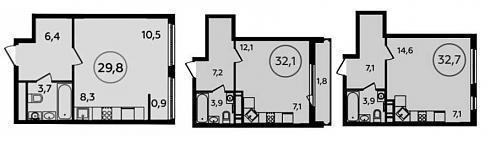 Застройщик не стал выделять студии в отдельную категорию, и у него есть на то веские основания – метраж таких квартир находится в пределах 29,7-32,7 кв. м, что является очень достойным показателем. Интересно, что в планировках некоторых квартир содержится намек на возможность обустройства в них маленькой лоджии, а в других вариантах лоджия, причем совсем не маленькая, конструктивно уже предусмотрена. Самые большие студии при этом лоджий лишены: