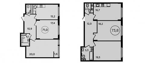| Апрель 2017 | 69,2-72,8 м2 | 5 821 670 - 7 193 101 ₽ | ~92 303 ₽ | -1.05% |