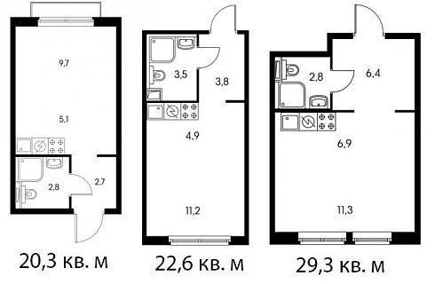 В башнях размер студий не превышает 20 кв. м, в многосекционных корпусах можно найти варианты с такой же и намного большей площадью: