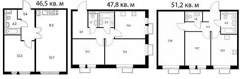 Находящиеся в 12 и в 13 секциях корпуса №13 квартиры общей площадью 46,5-46,9 кв.м ПИК, видимо, по недоразумению отнес к двухкомнатным. Между тем, самые маленькие, но «честные» двушки находятся в корпусах башенного типа: