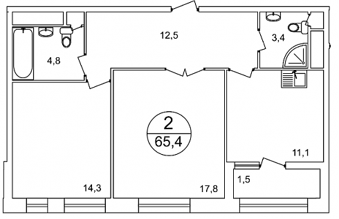 Так выглядит планировка минимальной по площади двухкомнатной квартиры ЖК: