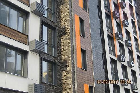 Корпуса в Комплексе, как и говорилось выше, монолитные, их наружные стены выполнены из «легкого бетона», вентилируемые фасады отделаны фиброцементными панелями, клинкерной плиткой и компакт-ламинатом.