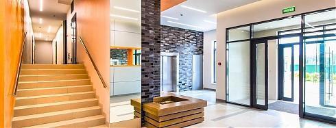 В подъездах есть колясочные и помещения для консьержа, установлены лифты OTIS, мусоропроводов нет,