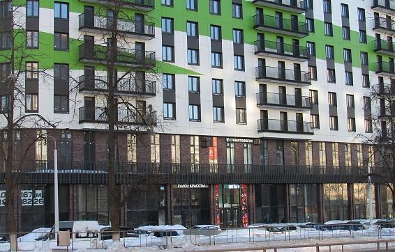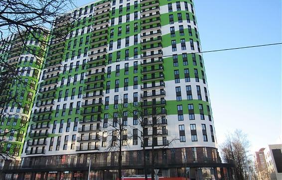 три этажа стилобата облицовываются кирпичом, внешние стены жилых этажей с 4 по 25 выполнены по технологии вентилируемого фасада и закрываются фиброцементными панелями белого и лаймового цветов.