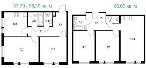 Двухкомнатные. В угловых вариантах при наличии двух санузлов кухня будет иметь стандартный размер, в линейных планировках, доступных в корпусах 1.1 и 7.2. площадь двушки превышает 66 кв. м, а кухня здесь приобретает статус кухни-гостиной:
