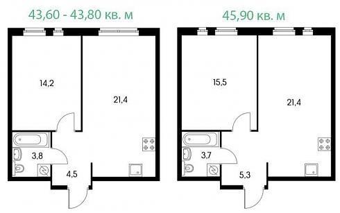 | Сентябрь 2018 | 43,4-45,6 м2 | 4 991 000 - 5 449 200 ₽ | ~118 639 ₽ | |