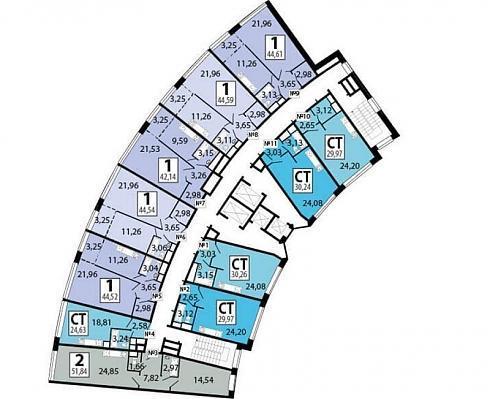 Далеко не во всех квартирах дух жилища будет чувствовать себя вольготно – для этого ему нужны прямые углы. А углы эти, правда не со всех сторон фасада, Вы можете найти в квартирах, расположенных в шести секциях из одиннадцати (2, 3, 4, 9, 10, 11).