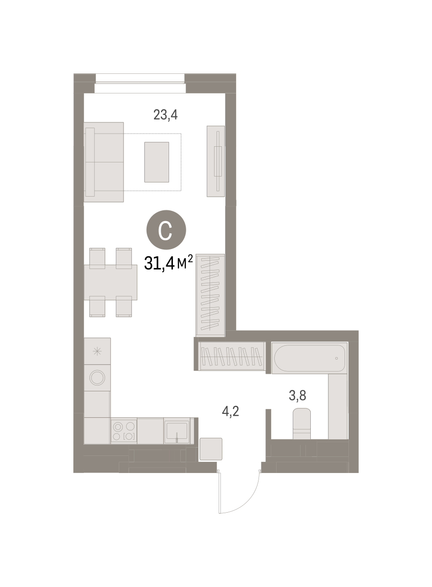 Студийные планировки полагаются и тем квартирам, метраж которых достигает 37,9 кв. м.
