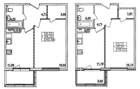Однокомнатные. Принципиальной разницы в планировках тут нет, в площадях – тоже.