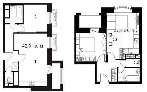 Однокомнатные. Здесь все более-менее привычно, планировки схожи, отличия будут лишь в нюансах и, естественно, в метражах: