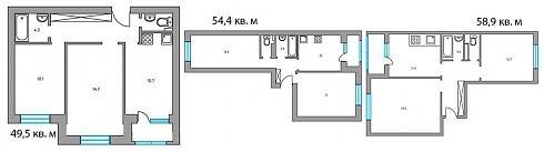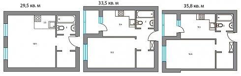 Для трехкомнатных квартир выбраны несколько вариантов распашных планировочных решений, при которых их площадь все равно не будет выходить за рамки 70 кв. м: