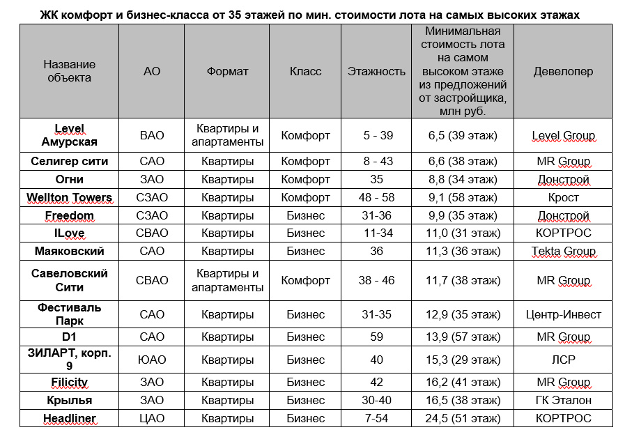 Среди проектов комфорт-класса самые привлекательные цены на высоких этажах зафиксированы в ЖК Level Амурская и «Селигер Сити». На 38 и 39 этаже этих комплексов можно приобрести квартиру стоимостью от 6,5 и 6,6 млн рублей соответственно.