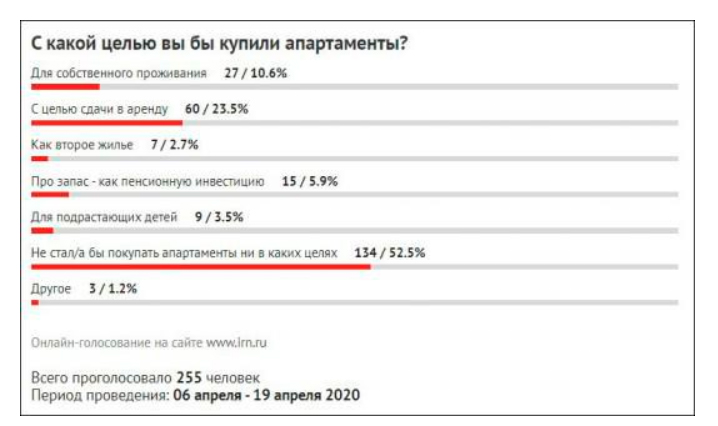 В сегменте апартаментов доля инвестиционного спроса выше, чем в новостройках с официальным жилым статусом. «В отдельных проектах апартаментов инвестиционный спрос составляет до 50-60%, в то время как в большинстве квартирных проектов не превышает 15%», - говорит Василий Фетисов. По данным онлайн-голосования на IRN.RU, для собственного проживания апартаменты купили бы всего 10,6% ответивших, в то время как 23,5% приобрели бы апартаменты для сдачи в аренду.
